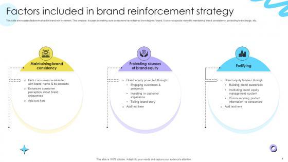 This slide showcases factors involved in brand reinforcement. This template focuses on making sure consumers have desired knowledge of brand. It covers aspects related to maintaining brand consistency, protecting brand image, etc. Do you have an important presentation coming up Are you looking for something that will make your presentation stand out from the rest Look no further than Factors Included In Brand Reinforcement Encouraging Repetitive Customer Purchase Ppt Sample. With our professional designs, you can trust that your presentation will pop and make delivering it a smooth process. And with Slidegeeks, you can trust that your presentation will be unique and memorable. So why wait Grab Factors Included In Brand Reinforcement Encouraging Repetitive Customer Purchase Ppt Sample today and make your presentation stand out from the rest This slide showcases factors involved in brand reinforcement. This template focuses on making sure consumers have desired knowledge of brand. It covers aspects related to maintaining brand consistency, protecting brand image, etc.