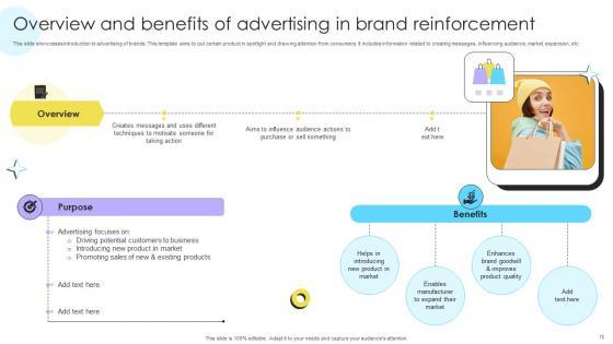 This slide showcases introduction to advertising of brands. This template aims to put certain product in spotlight and drawing attention from consumers. It includes information related to creating messages, influencing audience, market expansion, etc. This modern and well-arranged Overview And Benefits Of Advertising In Brand Encouraging Repetitive Customer Purchase Ppt Slide provides lots of creative possibilities. It is very simple to customize and edit with the Powerpoint Software. Just drag and drop your pictures into the shapes. All facets of this template can be edited with Powerpoint, no extra software is necessary. Add your own material, put your images in the places assigned for them, adjust the colors, and then you can show your slides to the world, with an animated slide included. This slide showcases introduction to advertising of brands. This template aims to put certain product in spotlight and drawing attention from consumers. It includes information related to creating messages, influencing audience, market expansion, etc.