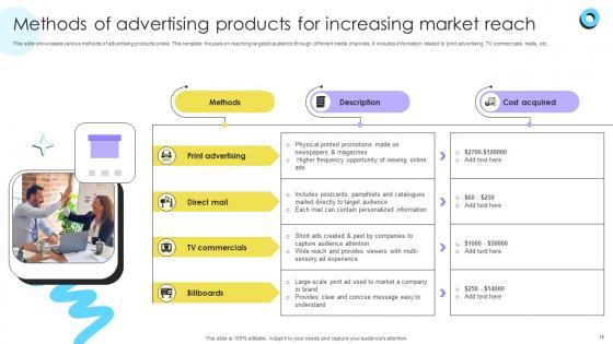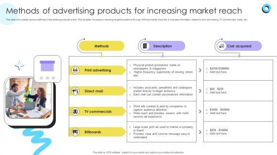 This slide showcases various methods of advertising products online. This template focuses on reaching targeted audience through different media channels. It includes information related to print advertising, TV commercials, mails, etc. Make sure to capture your audiences attention in your business displays with our gratis customizable Methods Of Advertising Products For Increasing Encouraging Repetitive Customer Purchase Ppt Sample. These are great for business strategies, office conferences, capital raising or task suggestions. If you desire to acquire more customers for your tech business and ensure they stay satisfied, create your own sales presentation with these plain slides. This slide showcases various methods of advertising products online. This template focuses on reaching targeted audience through different media channels. It includes information related to print advertising, TV commercials, mails, etc.