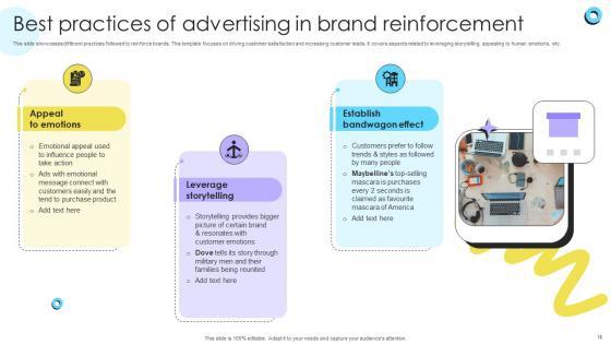 This slide showcases different practices followed to reinforce brands. This template focuses on driving customer satisfaction and increasing customer leads. It covers aspects related to leveraging storytelling, appealing to human emotions, etc. Create an editable Best Practices Of Advertising In Brand Reinforcement Encouraging Repetitive Customer Purchase Ppt Slide that communicates your idea and engages your audience. Whether you are presenting a business or an educational presentation, pre-designed presentation templates help save time. Best Practices Of Advertising In Brand Reinforcement Encouraging Repetitive Customer Purchase Ppt Slide is highly customizable and very easy to edit, covering many different styles from creative to business presentations. Slidegeeks has creative team members who have crafted amazing templates. So, go and get them without any delay. This slide showcases different practices followed to reinforce brands. This template focuses on driving customer satisfaction and increasing customer leads. It covers aspects related to leveraging storytelling, appealing to human emotions, etc.
