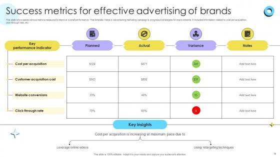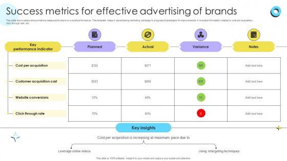 This slide showcases various metrics measured to improve overall performance. This template helps in ascertaining marketing campaigns progress and strategies for improvements. It includes information related to cost per acquisition, click through rate, etc. Retrieve professionally designed Success Metrics For Effective Advertising Encouraging Repetitive Customer Purchase Ppt Powerpoint to effectively convey your message and captivate your listeners. Save time by selecting pre-made slideshows that are appropriate for various topics, from business to educational purposes. These themes come in many different styles, from creative to corporate, and all of them are easily adjustable and can be edited quickly. Access them as PowerPoint templates or as Google Slides themes. You do not have to go on a hunt for the perfect presentation because Slidegeeks got you covered from everywhere. This slide showcases various metrics measured to improve overall performance. This template helps in ascertaining marketing campaigns progress and strategies for improvements. It includes information related to cost per acquisition, click through rate, etc.