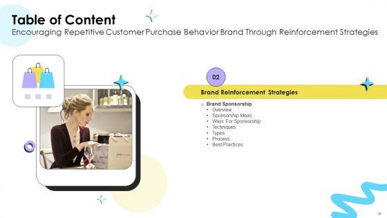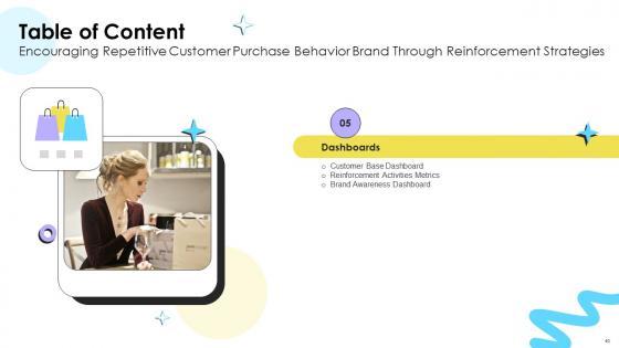 This Encouraging Repetitive Customer Purchase Behavior Brand Through Reinforcement Strategies Ppt Template is designed to help you retain your audiences attention. This content-ready PowerPoint Template enables you to take your audience on a journey and share information in a way that is easier to recall. It helps you highlight the crucial parts of your work so that the audience does not get saddled with information download. This fifty seven-slide PPT Deck comes prepared with the graphs and charts you could need to showcase your information through visuals. You only need to enter your own data in them. Download this editable PowerPoint Theme and walk into that meeting with confidence. Our Encouraging Repetitive Customer Purchase Behavior Brand Through Reinforcement Strategies Ppt Template are topically designed to provide an attractive backdrop to any subject. Use them to look like a presentation pro.