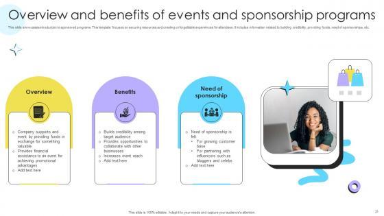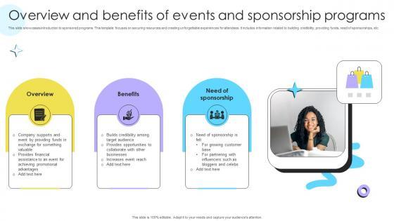 This slide showcases introduction to sponsored programs. This template focuses on securing resources and creating unforgettable experiences for attendees. It includes information related to building credibility, providing funds, need of sponsorships, etc. Welcome to our selection of the Overview And Benefits Of Events And Encouraging Repetitive Customer Purchase Ppt Presentation. These are designed to help you showcase your creativity and bring your sphere to life. Planning and Innovation are essential for any business that is just starting out. This collection contains the designs that you need for your everyday presentations. All of our PowerPoints are 100Percent editable, so you can customize them to suit your needs. This multi-purpose template can be used in various situations. Grab these presentation templates today. This slide showcases introduction to sponsored programs. This template focuses on securing resources and creating unforgettable experiences for attendees. It includes information related to building credibility, providing funds, need of sponsorships, etc.