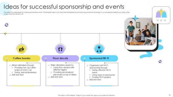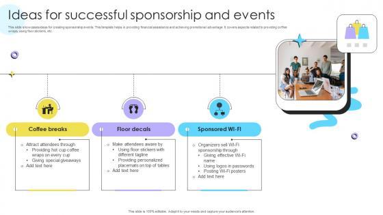 This slide showcases ideas for creating sponsorship events. This template helps in providing financial assistance and achieving promotional advantage. It covers aspects related to providing coffee wraps, using floor stickers, etc. If you are looking for a format to display your unique thoughts, then the professionally designed Ideas For Successful Sponsorship And Events Encouraging Repetitive Customer Purchase Ppt Presentation is the one for you. You can use it as a Google Slides template or a PowerPoint template. Incorporate impressive visuals, symbols, images, and other charts. Modify or reorganize the text boxes as you desire. Experiment with shade schemes and font pairings. Alter, share or cooperate with other people on your work. Download Ideas For Successful Sponsorship And Events Encouraging Repetitive Customer Purchase Ppt Presentation and find out how to give a successful presentation. Present a perfect display to your team and make your presentation unforgettable. This slide showcases ideas for creating sponsorship events. This template helps in providing financial assistance and achieving promotional advantage. It covers aspects related to providing coffee wraps, using floor stickers, etc.