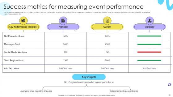 This slide showcases success metrics to track an events success. This template focuses on increasing audience engagement, maximizing revenue and obtaining more sponsorships. It includes information related to registrations made, messages sent, etc. Slidegeeks has constructed Success Metrics For Measuring Event Encouraging Repetitive Customer Purchase Ppt Presentation after conducting extensive research and examination. These presentation templates are constantly being generated and modified based on user preferences and critiques from editors. Here, you will find the most attractive templates for a range of purposes while taking into account ratings and remarks from users regarding the content. This is an excellent jumping-off point to explore our content and will give new users an insight into our top-notch PowerPoint Templates. This slide showcases success metrics to track an events success. This template focuses on increasing audience engagement, maximizing revenue and obtaining more sponsorships. It includes information related to registrations made, messages sent, etc.