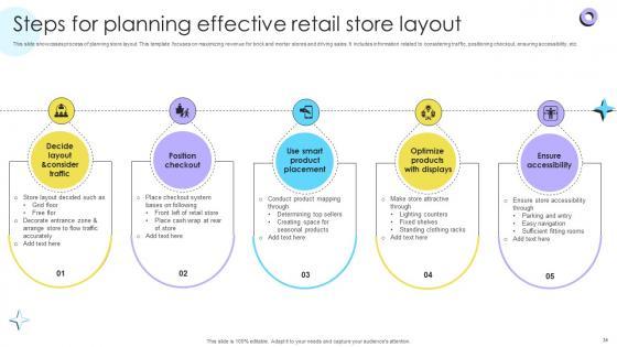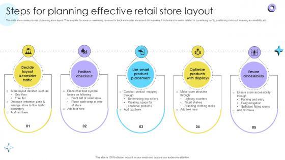 This slide showcases process of planning store layout. This template focuses on maximizing revenue for brick and mortar stores and driving sales. It includes information related to considering traffic, positioning checkout, ensuring accessibility, etc. Are you searching for a Steps For Planning Effective Retail Store Layout Encouraging Repetitive Customer Purchase Ppt Example that is uncluttered, straightforward, and original Its easy to edit, and you can change the colors to suit your personal or business branding. For a presentation that expresses how much effort you have put in, this template is ideal With all of its features, including tables, diagrams, statistics, and lists, its perfect for a business plan presentation. Make your ideas more appealing with these professional slides. Download Steps For Planning Effective Retail Store Layout Encouraging Repetitive Customer Purchase Ppt Example from Slidegeeks today. This slide showcases process of planning store layout. This template focuses on maximizing revenue for brick and mortar stores and driving sales. It includes information related to considering traffic, positioning checkout, ensuring accessibility, etc.