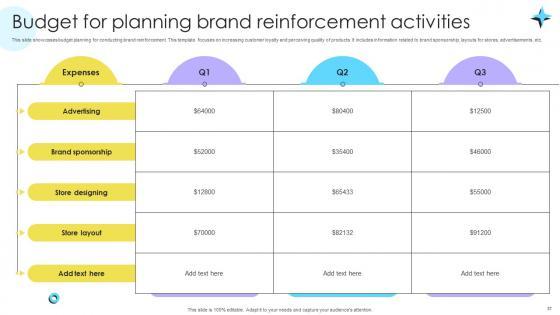 This slide showcases budget planning for conducting brand reinforcement. This template focuses on increasing customer loyalty and perceiving quality of products. It includes information related to brand sponsorship, layouts for stores, advertisements, etc. There are so many reasons you need a Budget For Planning Brand Reinforcement Activities Encouraging Repetitive Customer Purchase Ppt Slide. The first reason is you can not spend time making everything from scratch, Thus, Slidegeeks has made presentation templates for you too. You can easily download these templates from our website easily. This slide showcases budget planning for conducting brand reinforcement. This template focuses on increasing customer loyalty and perceiving quality of products. It includes information related to brand sponsorship, layouts for stores, advertisements, etc.