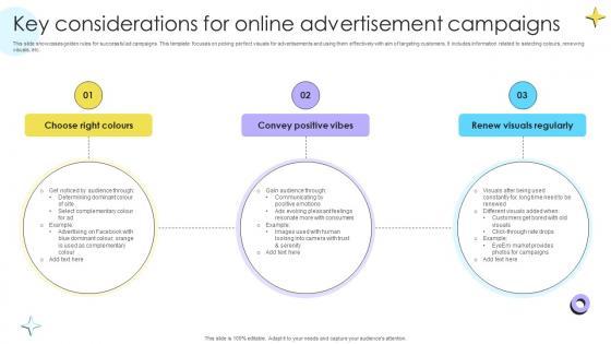 This slide showcases golden rules for successful ad campaigns. This template focuses on picking perfect visuals for advertisements and using them effectively with aim of targeting customers. It includes information related to selecting colours, renewing visuals, etc. Crafting an eye-catching presentation has never been more straightforward. Let your presentation shine with this tasteful yet straightforward Key Considerations For Online Advertisement Encouraging Repetitive Customer Purchase Ppt Sample template. It offers a minimalistic and classy look that is great for making a statement. The colors have been employed intelligently to add a bit of playfulness while still remaining professional. Construct the ideal Key Considerations For Online Advertisement Encouraging Repetitive Customer Purchase Ppt Sample that effortlessly grabs the attention of your audience Begin now and be certain to wow your customers This slide showcases golden rules for successful ad campaigns. This template focuses on picking perfect visuals for advertisements and using them effectively with aim of targeting customers. It includes information related to selecting colours, renewing visuals, etc.