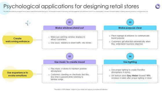 This slide showcases psychological factors used to create effective retail store layout. This template focuses on maximizing customer engagement and satisfaction which in turn impacts sales. It includes information related to creating welcoming entrance, evoking emotions, etc. The best PPT templates are a great way to save time, energy, and resources. Slidegeeks have 100 percent editable powerpoint slides making them incredibly versatile. With these quality presentation templates, you can create a captivating and memorable presentation by combining visually appealing slides and effectively communicating your message. Download Psychological Applications For Designing Retail Encouraging Repetitive Customer Purchase Ppt Presentation from Slidegeeks and deliver a wonderful presentation. This slide showcases psychological factors used to create effective retail store layout. This template focuses on maximizing customer engagement and satisfaction which in turn impacts sales. It includes information related to creating welcoming entrance, evoking emotions, etc