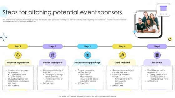 This slide showcases process for pitching to sponsors. This template helps sponsors in promoting their brand for collecting leads and gaining loyal customers. It includes information related to providing social proof, introducing organisation, etc. The Steps For Pitching Potential Event Sponsors Encouraging Repetitive Customer Purchase Ppt Example is a compilation of the most recent design trends as a series of slides. It is suitable for any subject or industry presentation, containing attractive visuals and photo spots for businesses to clearly express their messages. This template contains a variety of slides for the user to input data, such as structures to contrast two elements, bullet points, and slides for written information. Slidegeeks is prepared to create an impression. This slide showcases process for pitching to sponsors. This template helps sponsors in promoting their brand for collecting leads and gaining loyal customers. It includes information related to providing social proof, introducing organisation, etc.