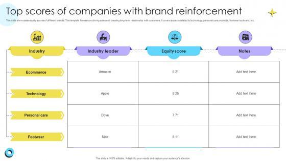 This slide showcases equity scores of different brands. This template focuses on driving sales and creating long-term relationship with customers. It covers aspects related to technology, personal care products, footwear top brand, etc. Do you know about Slidesgeeks Top Scores Of Companies With Brand Encouraging Repetitive Customer Purchase Ppt Presentation These are perfect for delivering any kind od presentation. Using it, create PowerPoint presentations that communicate your ideas and engage audiences. Save time and effort by using our pre-designed presentation templates that are perfect for a wide range of topic. Our vast selection of designs covers a range of styles, from creative to business, and are all highly customizable and easy to edit. Download as a PowerPoint template or use them as Google Slides themes. This slide showcases equity scores of different brands. This template focuses on driving sales and creating long-term relationship with customers. It covers aspects related to technology, personal care products, footwear top brand, etc.
