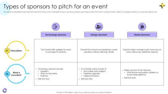 This slide showcases different type of sponsors required for hosting events. This template focuses on providing companies opportunities to market their brand. It includes information related to free gadgets, publishing on social media platforms, etc. Make sure to capture your audiences attention in your business displays with our gratis customizable Types Of Sponsors To Pitch For An Event Encouraging Repetitive Customer Purchase Ppt Example. These are great for business strategies, office conferences, capital raising or task suggestions. If you desire to acquire more customers for your tech business and ensure they stay satisfied, create your own sales presentation with these plain slides. This slide showcases different type of sponsors required for hosting events. This template focuses on providing companies opportunities to market their brand. It includes information related to free gadgets, publishing on social media platforms, etc.