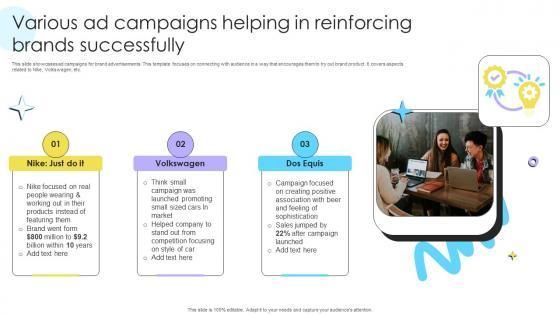 This slide showcases ad campaigns for brand advertisements. This template focuses on connecting with audience in a way that encourages them to try out brand product. It covers aspects related to Nike, Volkswagen, etc. Formulating a presentation can take up a lot of effort and time, so the content and message should always be the primary focus. The visuals of the PowerPoint can enhance the presenters message, so our Various Ad Campaigns Helping In Reinforcing Encouraging Repetitive Customer Purchase Ppt Powerpoint was created to help save time. Instead of worrying about the design, the presenter can concentrate on the message while our designers work on creating the ideal templates for whatever situation is needed. Slidegeeks has experts for everything from amazing designs to valuable content, we have put everything into Various Ad Campaigns Helping In Reinforcing Encouraging Repetitive Customer Purchase Ppt Powerpoint This slide showcases ad campaigns for brand advertisements. This template focuses on connecting with audience in a way that encourages them to try out brand product. It covers aspects related to Nike, Volkswagen, etc.