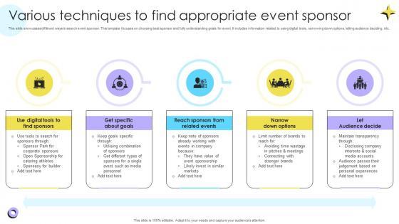 This slide showcases different ways to search event sponsor. This template focuses on choosing best sponsor and fully understanding goals for event. It includes information related to using digital tools, narrowing down options, letting audience deciding, etc. Coming up with a presentation necessitates that the majority of the effort goes into the content and the message you intend to convey. The visuals of a PowerPoint presentation can only be effective if it supplements and supports the story that is being told. Keeping this in mind our experts created Various Techniques To Find Appropriate Event Encouraging Repetitive Customer Purchase Ppt Powerpoint to reduce the time that goes into designing the presentation. This way, you can concentrate on the message while our designers take care of providing you with the right template for the situation. This slide showcases different ways to search event sponsor. This template focuses on choosing best sponsor and fully understanding goals for event. It includes information related to using digital tools, narrowing down options, letting audience deciding, etc.