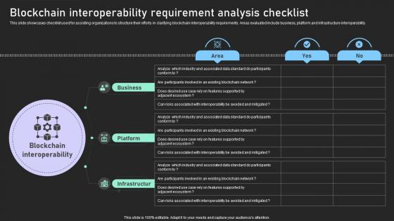 This slide showcases checklist used for assisting organizations to structure their efforts in clarifying blockchain interoperability requirements. Areas evaluated include business, platform and infrastructure interoperability. Boost your pitch with our creative Blockchain Interoperability Requirement Analysis Checklist BCT SS V. Deliver an awe-inspiring pitch that will mesmerize everyone. Using these presentation templates you will surely catch everyones attention. You can browse the ppts collection on our website. We have researchers who are experts at creating the right content for the templates. So you do not have to invest time in any additional work. Just grab the template now and use them. This slide showcases checklist used for assisting organizations to structure their efforts in clarifying blockchain interoperability requirements. Areas evaluated include business, platform and infrastructure interoperability.
