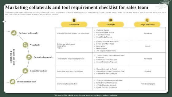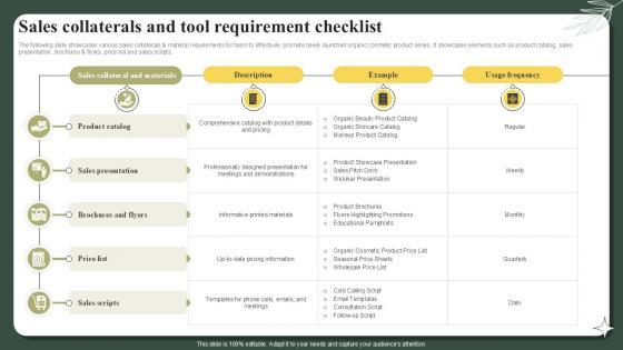 The following slide showcases various sales collaterals and material requirements for team to effectively promote newly launched organic cosmetic product series. It showcases elements such as product catalog, sales presentation, brochures and flyers, price list and sales scripts. Make sure to capture your audiences attention in your business displays with our gratis customizable Sales Collaterals And Tool Requirement Checklist Successful Launch Ppt Sample These are great for business strategies, office conferences, capital raising or task suggestions. If you desire to acquire more customers for your tech business and ensure they stay satisfied, create your own sales presentation with these plain slides. The following slide showcases various sales collaterals and material requirements for team to effectively promote newly launched organic cosmetic product series. It showcases elements such as product catalog, sales presentation, brochures and flyers, price list and sales scripts.