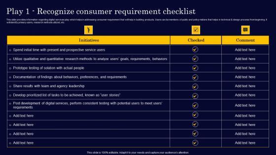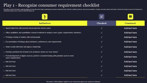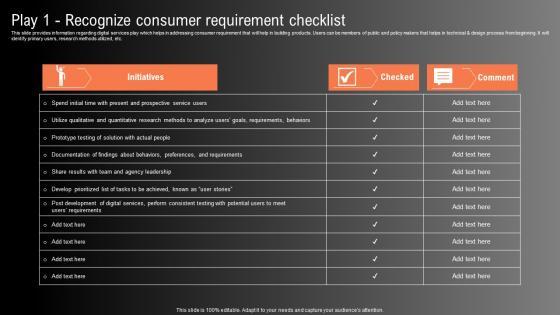This slide provides information regarding digital services play which helps in addressing consumer requirement that will help in building products. Users can be members of public and policy makers that helps in technical and design process from beginning. It will identify primary users, research methods utilized, etc. Whether you have daily or monthly meetings, a brilliant presentation is necessary. Play 1 Recognize Consumer Requirement Checklist Technological Innovation Playbook Guidelines Pdf can be your best option for delivering a presentation. Represent everything in detail using Play 1 Recognize Consumer Requirement Checklist Technological Innovation Playbook Guidelines Pdf and make yourself stand out in meetings. The template is versatile and follows a structure that will cater to your requirements. All the templates prepared by Slidegeeks are easy to download and edit. Our research experts have taken care of the corporate themes as well. So, give it a try and see the results. This slide provides information regarding digital services play which helps in addressing consumer requirement that will help in building products. Users can be members of public and policy makers that helps in technical and design process from beginning. It will identify primary users, research methods utilized, etc.
