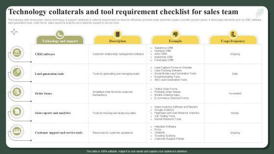 The following slide showcases various technology and support collaterals and material requirements for team to effectively promote newly launched organic cosmetic product series. It showcases elements such as CRM software, lead generation tools, order forms, sales reports and analytics and customer support and service tools. Retrieve professionally designed Technology Collaterals And Tool Requirement Checklist For Sales Team Successful Launch Ppt Slide to effectively convey your message and captivate your listeners. Save time by selecting pre-made slideshows that are appropriate for various topics, from business to educational purposes. These themes come in many different styles, from creative to corporate, and all of them are easily adjustable and can be edited quickly. Access them as PowerPoint templates or as Google Slides themes. You do not have to go on a hunt for the perfect presentation because Slidegeeks got you covered from everywhere. The following slide showcases various technology and support collaterals and material requirements for team to effectively promote newly launched organic cosmetic product series. It showcases elements such as CRM software, lead generation tools, order forms, sales reports and analytics and customer support and service tools.