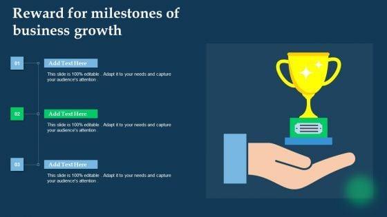 Presenting Reward For Milestones Of Business Growth Slides PDF to dispense important information. This template comprises three stages. It also presents valuable insights into the topics including Reward Milestones, Business Growth. This is a completely customizable PowerPoint theme that can be put to use immediately. So, download it and address the topic impactfully.
