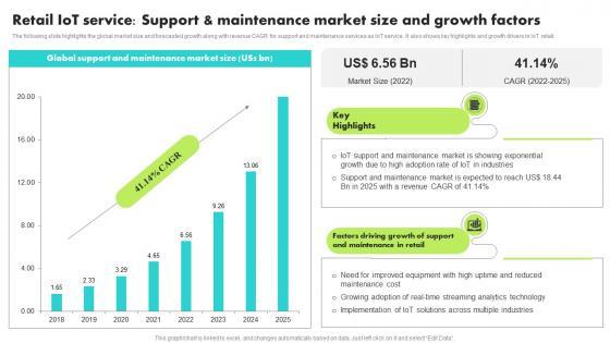 The following slide highlights the global market size and forecasted growth along with revenue CAGR for support and maintenance services as IoT service. It also shows key highlights and growth drivers in IoT retail. If you are looking for a format to display your unique thoughts, then the professionally designed IoT Application In Global Retail IoT Service Support And Maintenance Market Size Designs PDF is the one for you. You can use it as a Google Slides template or a PowerPoint template. Incorporate impressive visuals, symbols, images, and other charts. Modify or reorganize the text boxes as you desire. Experiment with shade schemes and font pairings. Alter, share or cooperate with other people on your work. Download IoT Application In Global Retail IoT Service Support And Maintenance Market Size Designs PDF and find out how to give a successful presentation. Present a perfect display to your team and make your presentation unforgettable. The following slide highlights the global market size and forecasted growth along with revenue CAGR for support and maintenance services as IoT service. It also shows key highlights and growth drivers in IoT retail