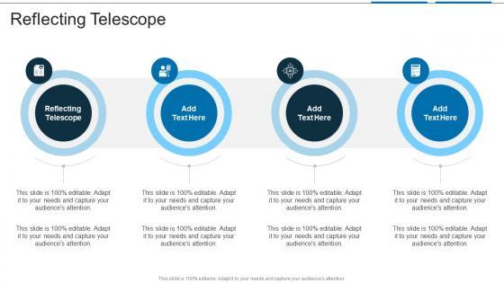 Presenting our innovatively designed set of slides titled Reflecting Telescope In Powerpoint And Google Slides Cpb. This completely editable PowerPoint graphic exhibits Reflecting Telescope that will help you convey the message impactfully. It can be accessed with Google Slides and is available in both standard screen and widescreen aspect ratios. Apart from this, you can download this well structured PowerPoint template design in different formats like PDF, JPG, and PNG. So, click the download button now to gain full access to this PPT design. Our Reflecting Telescope In Powerpoint And Google Slides Cpb are topically designed to provide an attractive backdrop to any subject. Use them to look like a presentation pro.
