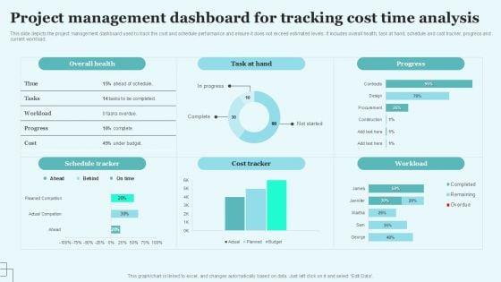 This slide depicts the project management dashboard used to track the cost and schedule performance and ensure it does not exceed estimated levels. It includes overall health, task at hand, schedule and cost tracker, progress and current workload. Pitch your topic with ease and precision using this Project Management Dashboard For Tracking Cost Time Analysis Background PDF. This layout presents information on Project Management Dashboard, Tracking Cost Time Analysis. It is also available for immediate download and adjustment. So, changes can be made in the color, design, graphics or any other component to create a unique layout.