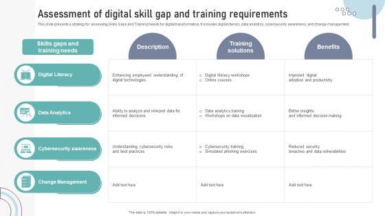 This slide presents a strategy for assessing Skills Gaps and Training Needs for digital transformation. It includes digital literacy, data analytics, cybersecurity awareness, and change management.Want to ace your presentation in front of a live audience Our Assessment Of Digital Skill Gap And Training Requirements DT SS V can help you do that by engaging all the users towards you. Slidegeeks experts have put their efforts and expertise into creating these impeccable powerpoint presentations so that you can communicate your ideas clearly. Moreover, all the templates are customizable, and easy-to-edit and downloadable. Use these for both personal and commercial use. This slide presents a strategy for assessing Skills Gaps and Training Needs for digital transformation. It includes digital literacy, data analytics, cybersecurity awareness, and change management.