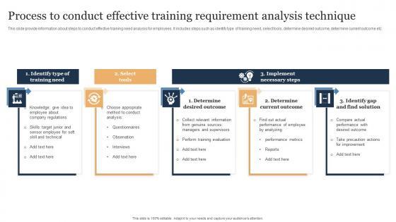 This slide provide information about steps to conduct effective training need analysis for employees. It includes steps such as identify type of training need, select tools, determine desired outcome, determine current outcome etc. Showcasing this set of slides titled Process To Conduct Effective Training Requirement Analysis Technique Graphics Pdf. The topics addressed in these templates are Training Requirement, Analysis Technique, Conduct Effective Training. All the content presented in this PPT design is completely editable. Download it and make adjustments in color, background, font etc. as per your unique business setting. This slide provide information about steps to conduct effective training need analysis for employees. It includes steps such as identify type of training need, select tools, determine desired outcome, determine current outcome etc.