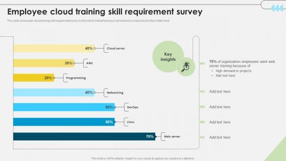 This slide showcases cloud training skill requirement survey to find which skillset training is demanded by employees for their betterment. Are you in need of a template that can accommodate all of your creative concepts This one is crafted professionally and can be altered to fit any style. Use it with Google Slides or PowerPoint. Include striking photographs, symbols, depictions, and other visuals. Fill, move around, or remove text boxes as desired. Test out color palettes and font mixtures. Edit and save your work, or work with colleagues. Download Workforce Competency Enhancement Employee Cloud Training Skill Requirement Survey DTE SS V and observe how to make your presentation outstanding. Give an impeccable presentation to your group and make your presentation unforgettable. This slide showcases cloud training skill requirement survey to find which skillset training is demanded by employees for their betterment.