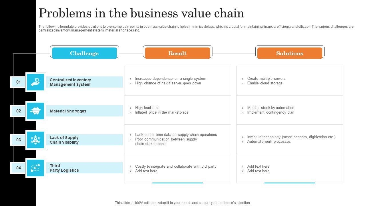 The following template provides solutions to overcome pain points in business value chain to helps minimize delays, which is crucial for maintaining financial efficiency and efficacy. The various challenges are centralized inventory management system, material shortages etc. Presenting Problems In The Business Value Chain Infographics PDF to dispense important information. This template comprises four stages. It also presents valuable insights into the topics including Centralized Inventory Management, Material Shortages, Lack Supply Chain Visibility. This is a completely customizable PowerPoint theme that can be put to use immediately. So, download it and address the topic impactfully.
