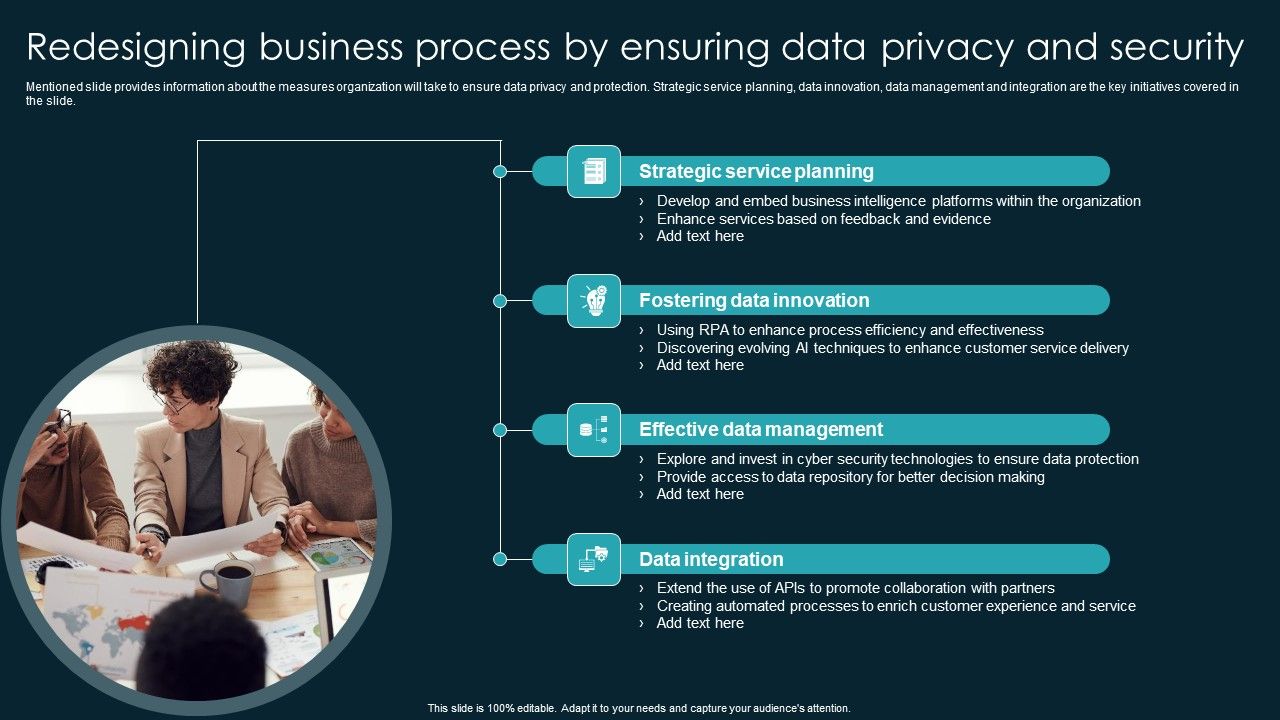 Mentioned slide provides information about the measures organization will take to ensure data privacy and protection. Strategic service planning, data innovation, data management and integration are the key initiatives covered in the slide. The best PPT templates are a great way to save time, energy, and resources. Slidegeeks have 100 percent editable powerpoint slides making them incredibly versatile. With these quality presentation templates, you can create a captivating and memorable presentation by combining visually appealing slides and effectively communicating your message. Download Redesigning Business Process By Ensuring Data Privacy And Security Infographics PDF from Slidegeeks and deliver a wonderful presentation.