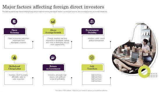 This slide represents major factors affecting foreign direct investors in entering international market. It covers open economy, above average growth, environment stability etc. There are so many reasons you need a Major Factors Affecting Foreign Direct Investors Ppt Outline Sample PDF. The first reason is you can not spend time making everything from scratch, Thus, Slidegeeks has made presentation templates for you too. You can easily download these templates from our website easily.