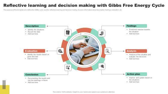 The purpose of this template is to define the GIBBs cycle used for reflective learning and decision making. It covers information about description, feelings, evaluation, etc. Presenting Reflective Learning And Decision Making With Gibbs Free Energy Cycle Icons PDF to dispense important information. This template comprises six stages. It also presents valuable insights into the topics including Feelings, Analysis, Action Plan. This is a completely customizable PowerPoint theme that can be put to use immediately. So, download it and address the topic impactfully.