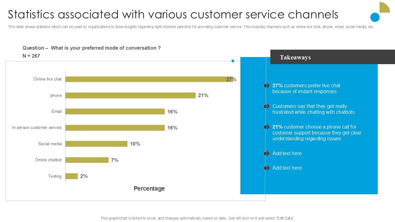 This slide shows statistics which can be used by organizations to draw insights regarding right channel selection for providing customer service. This includes channels such as online live chat, phone, email, social media, etc. This Service Strategy Guide To Maximize Customer Experience Statistics Associated With Various Customer Service Portrait PDF from Slidegeeks makes it easy to present information on your topic with precision. It provides customization options, so you can make changes to the colors, design, graphics, or any other component to create a unique layout. It is also available for immediate download, so you can begin using it right away. Slidegeeks has done good research to ensure that you have everything you need to make your presentation stand out. Make a name out there for a brilliant performance.