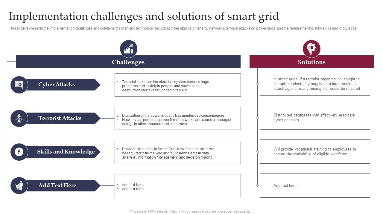 This slide represents the implementation challenges and solutions of smart grid technology, including cyber attacks on energy networks, terrorist attacks on power grids, and the requirement for new skills and knowledge. Slidegeeks is one of the best resources for PowerPoint templates. You can download easily and regulate Smart Grid Technology Implementation Challenges And Solutions Designs PDF for your personal presentations from our wonderful collection. A few clicks is all it takes to discover and get the most relevant and appropriate templates. Use our Templates to add a unique zing and appeal to your presentation and meetings. All the slides are easy to edit and you can use them even for advertisement purposes.