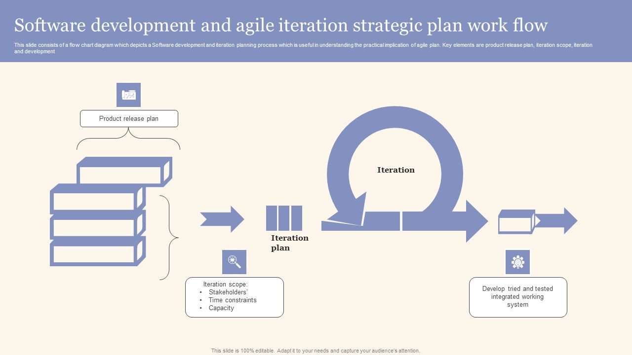 This slide consists of a flow chart diagram which depicts a Software development and iteration planning process which is useful in understanding the practical implication of agile plan. Key elements are product release plan, iteration scope, iteration and development. Showcasing this set of slides titled Software Development And Agile Iteration Strategic Plan Work Flow Mockup PDF. The topics addressed in these templates are Iteration, Iteration Plan, Product Release Plan, Capacity. All the content presented in this PPT design is completely editable. Download it and make adjustments in color, background, font etc. as per your unique business setting.