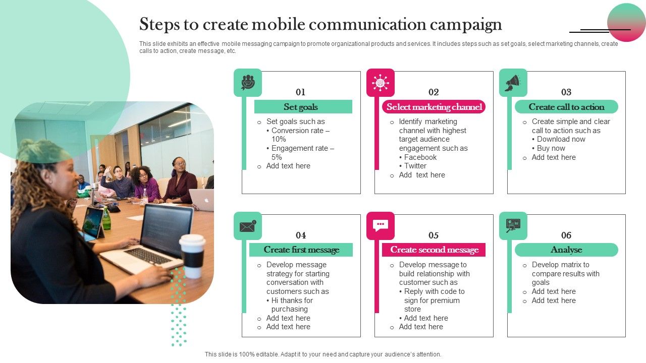 This slide exhibits an effective mobile messaging campaign to promote organizational products and services. It includes steps such as set goals, select marketing channels, create calls to action, create message, etc. Persuade your audience using this Steps To Create Mobile Communication Campaign Structure PDF. This PPT design covers six stages, thus making it a great tool to use. It also caters to a variety of topics including Set Goals, Select Marketing Channel, Create Call To Action, Create First Message, Create Second Message, Analyse. Download this PPT design now to present a convincing pitch that not only emphasizes the topic but also showcases your presentation skills.