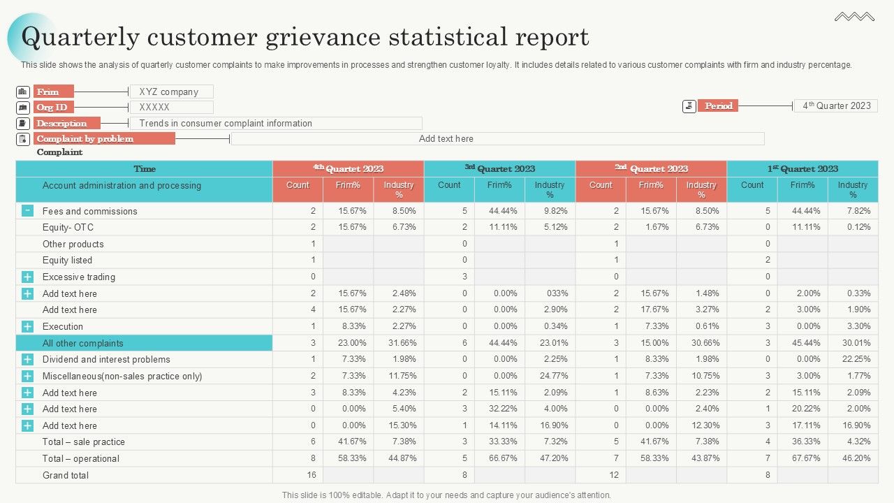 This slide shows the analysis of quarterly customer complaints to make improvements in processes and strengthen customer loyalty. It includes details related to various customer complaints with firm and industry percentage. Showcasing this set of slides titled Quarterly Customer Grievance Statistical Report Information PDF. The topics addressed in these templates are Quarterly, Customer Grievance, Statistical Report. All the content presented in this PPT design is completely editable. Download it and make adjustments in color, background, font etc. as per your unique business setting.